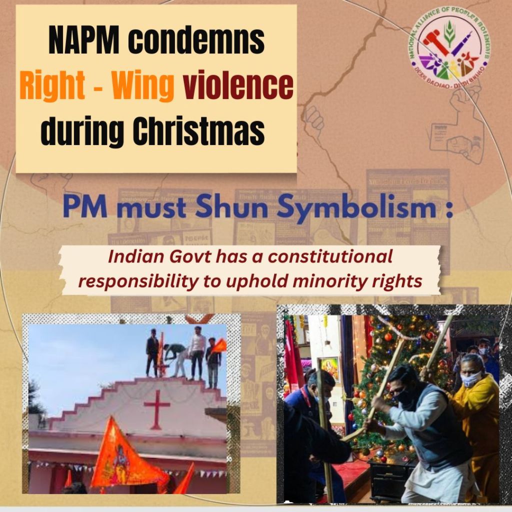 4th January, 2026: National Alliance of PeopleтАЩs Movements (NAPM) and Sadbhav Manch strongly condemns the widespread attacks and hooliganism by right-wing forces during the recent Christmas festivities. This is part of the rising pattern of hate-filled violence that is being inflicted upon religious minorities in India, in particular against Muslims and Christians. While on the one hand, the Prime Minister exhibits hollow symbolism, on the other hand, crimes against minorities are on a relentless rise on the ground. We condemn the hypocrisy, targeted violence and call for accountability of the state towards the constitutional and human rights of religious minorities in India, including their right to safety, dignity and freedom to practice faith, fearlessly.